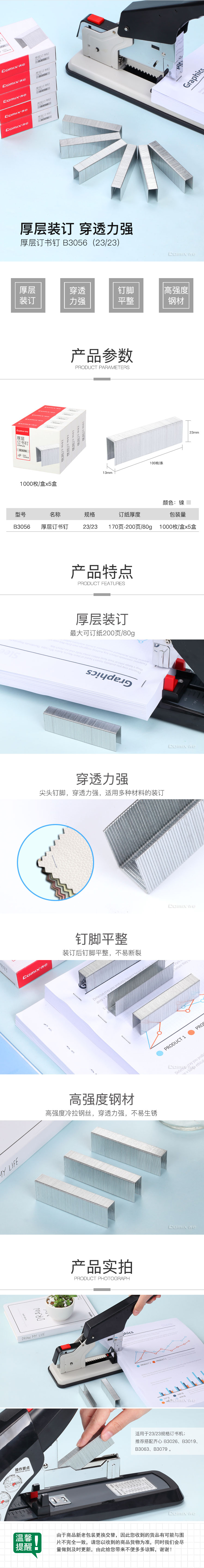 商品名称:齐心 B3056 厚层订书钉(23/23)200页 1000枚/盒