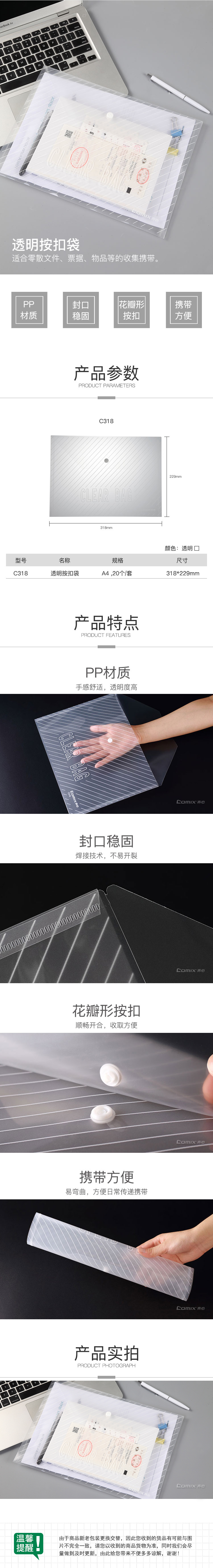 商品名称:齐心 C318 巨划算经典条纹透明按扣袋 A4 20个/套