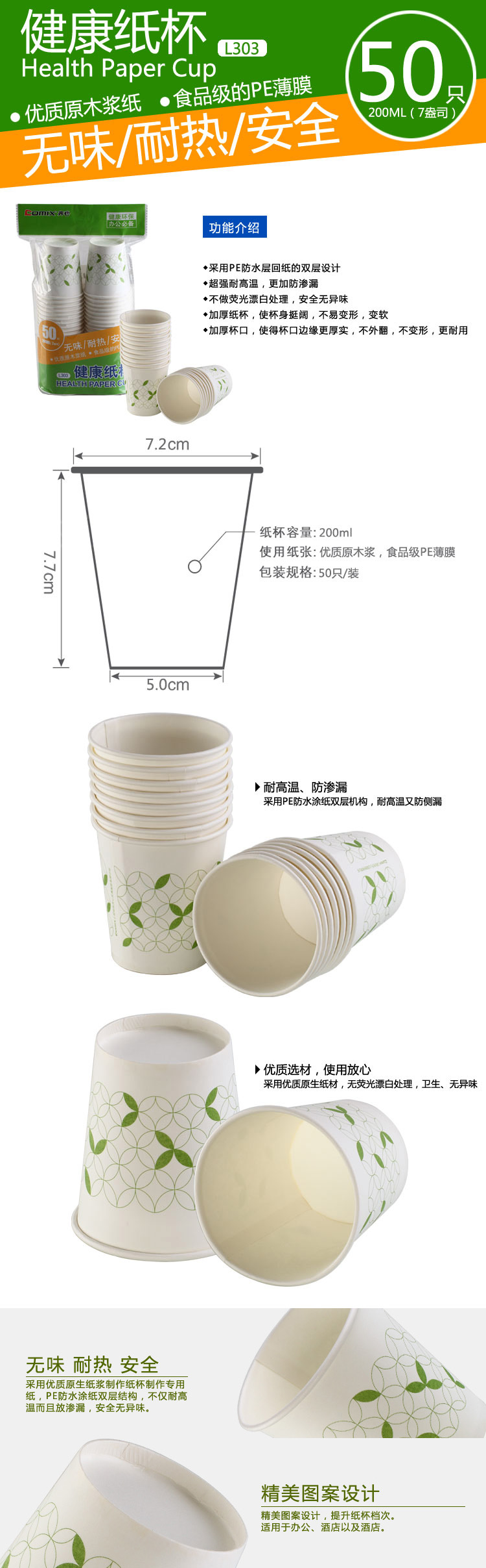 商品名称:齐心 L303 健康纸杯50个装7安