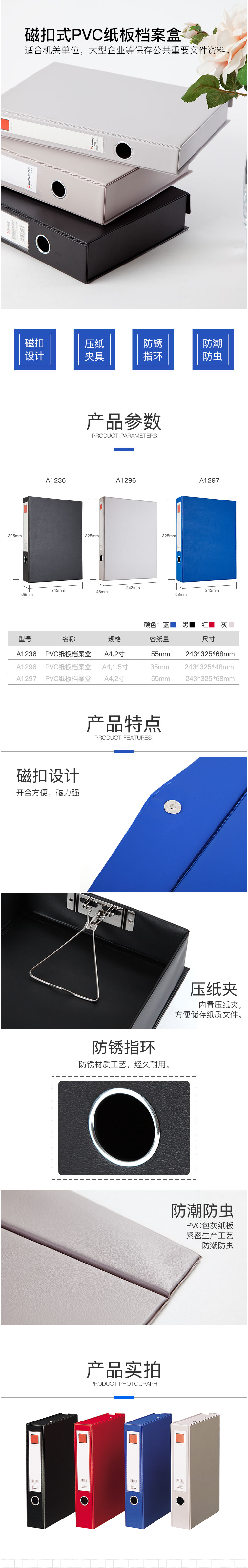 商品名称:齐心 A1236 办公必备磁扣式PVC档案盒 A4 55MM 带压纸夹