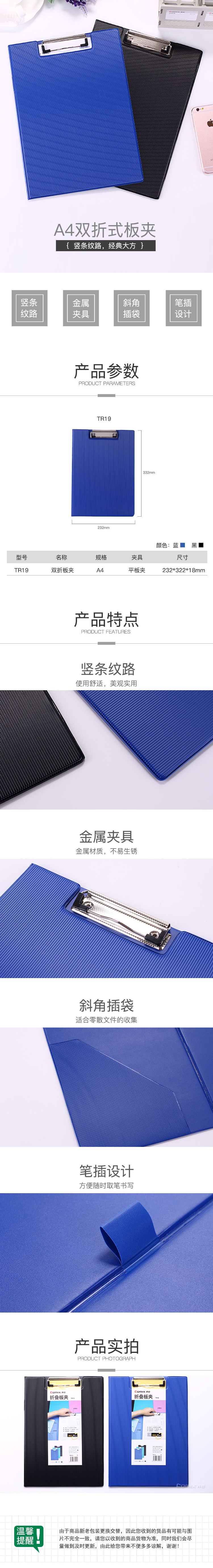 商品名称:齐心 TR19 办公必备双折式板夹 A4 直条纹